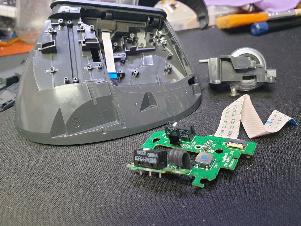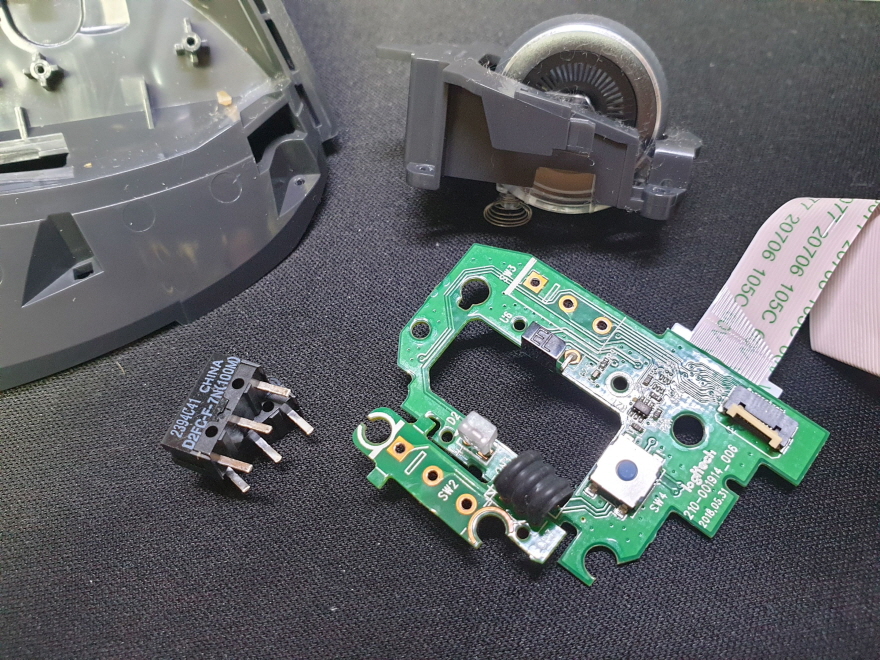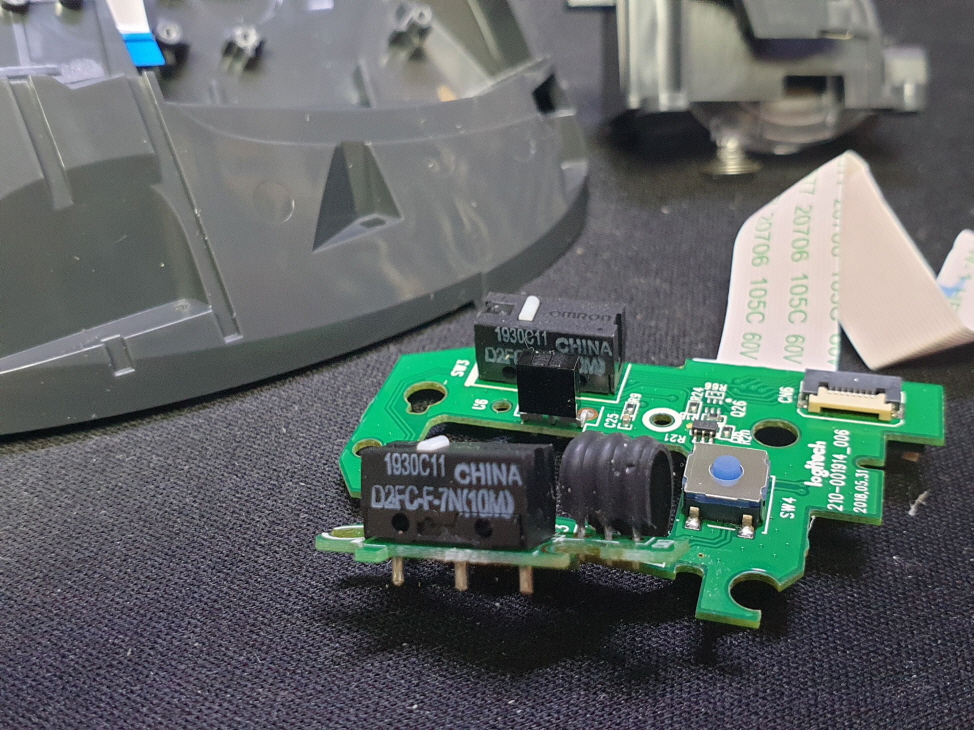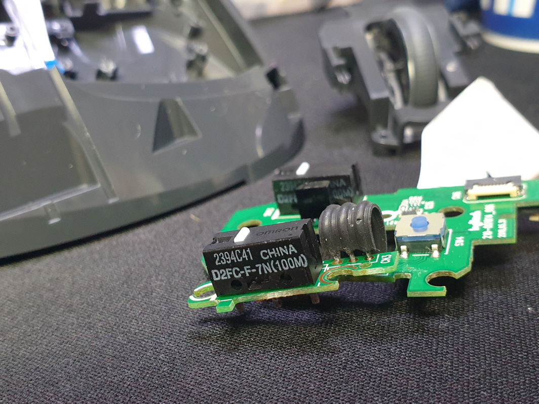 드래그시 풀리거나 잘안눌리는 씹히는 증상, 버튼내 스위치불량으로 새 스위치 D2FC-F-7N(100M) 좌우교체 수리 진행합니다.