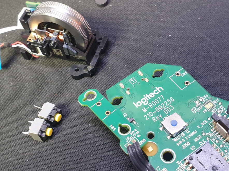 버튼내 스위치불량으로 새 스위치 카일 저소음 옐로우스위치 좌우교체 수리 진행합니다. 해당 모델은 일반스위치로 교체가 안됩니다. 반대로 MX Master 3(일반스위치) 에서 저소음스위치로 교체가 가능합니다.