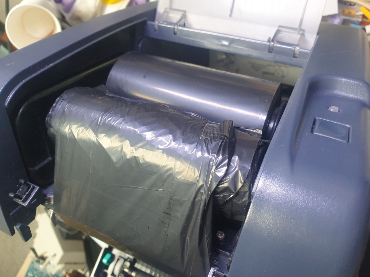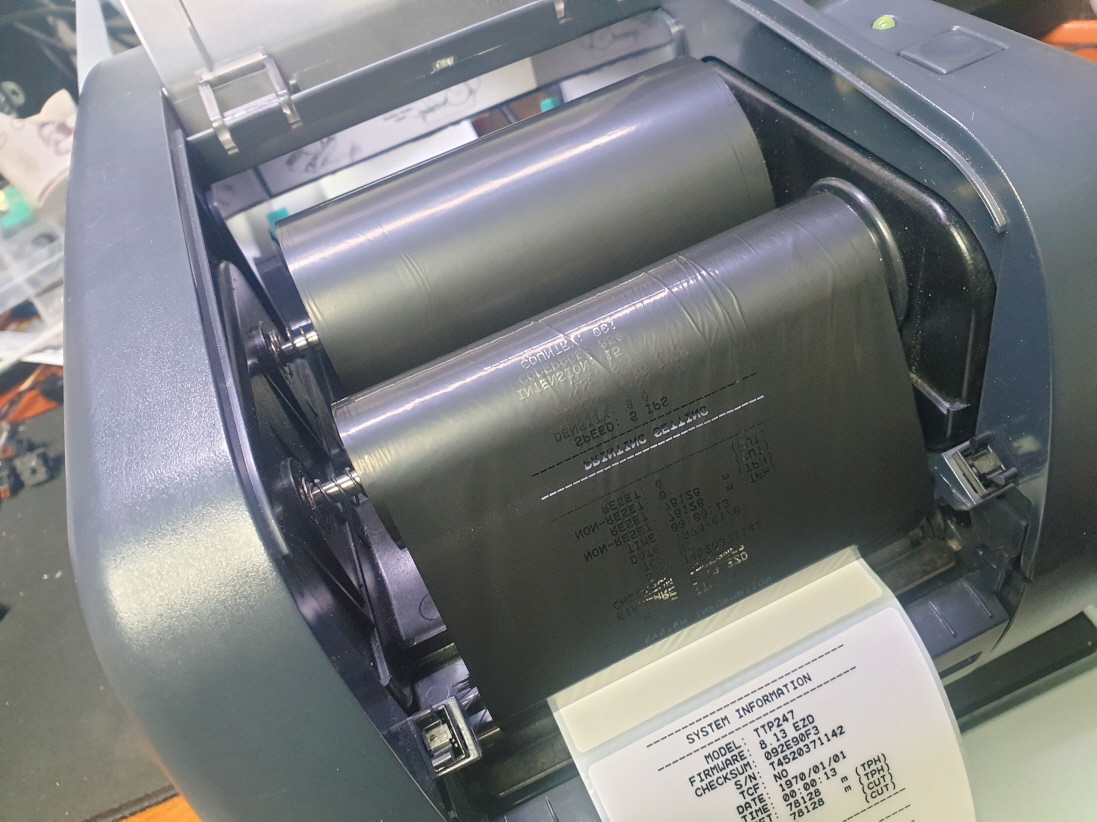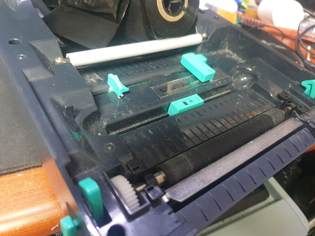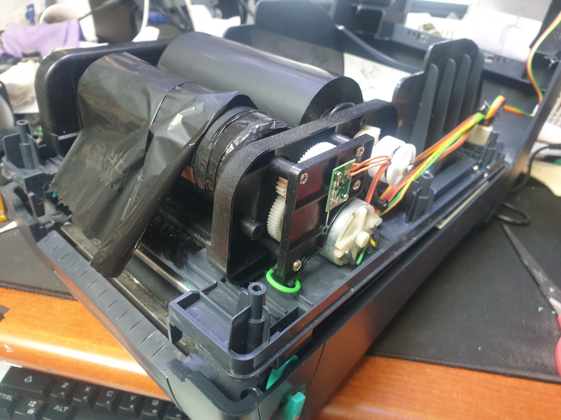 라벨인쇄시 리본(먹지)가 같이 딸려나오는 문제로 수리 진행합니다.