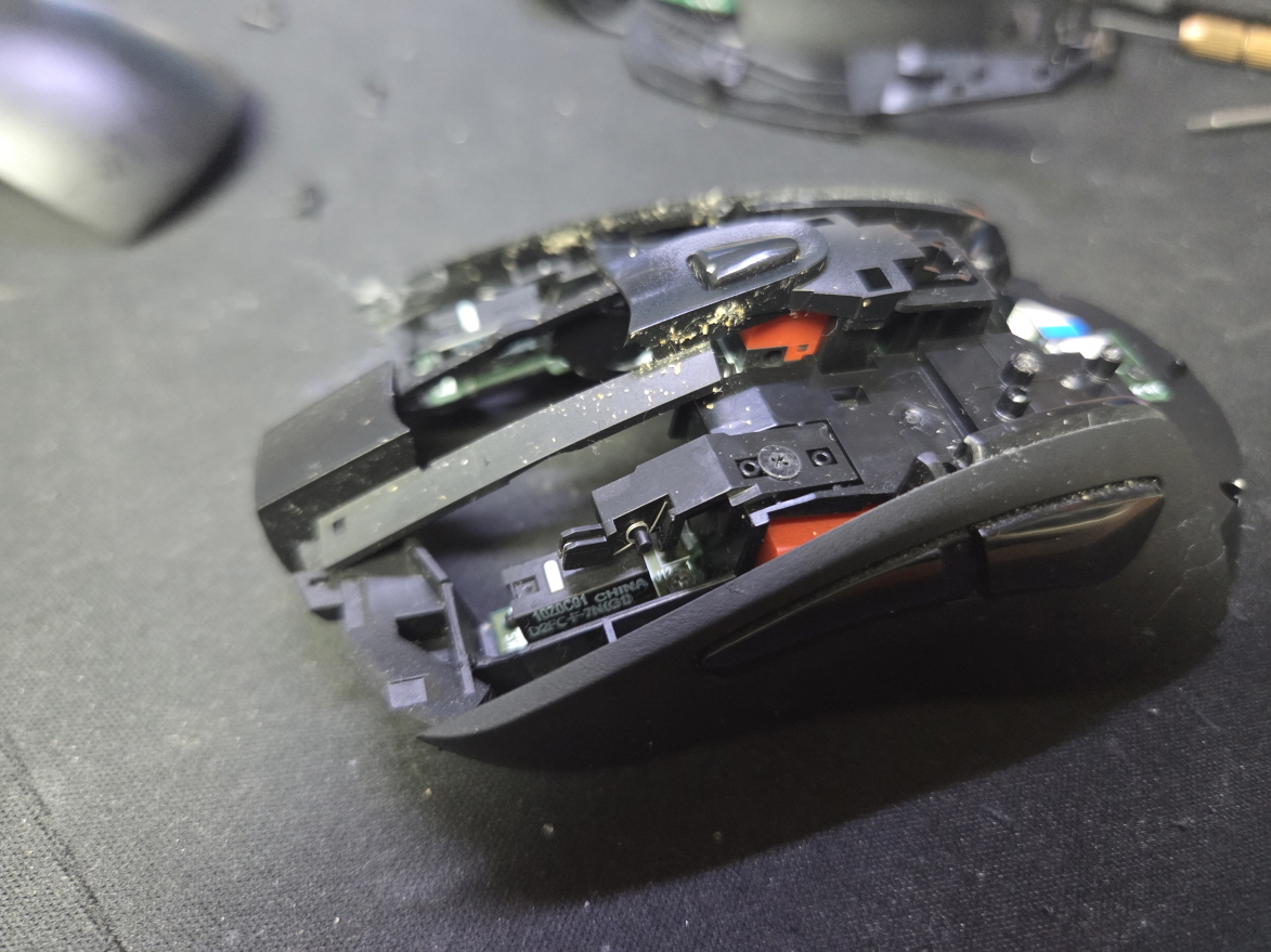 버튼내 스위치불량으로 새 스위치 D2FC-F-7N(100M) 좌우교체 수리 진행합니다. 추가로 스크롤휠센서도 함께 교체합니다.