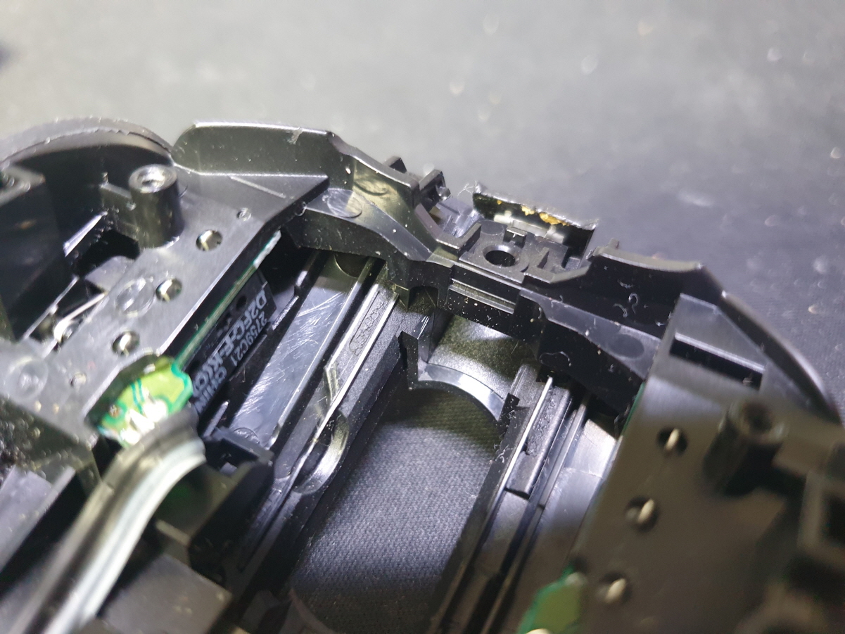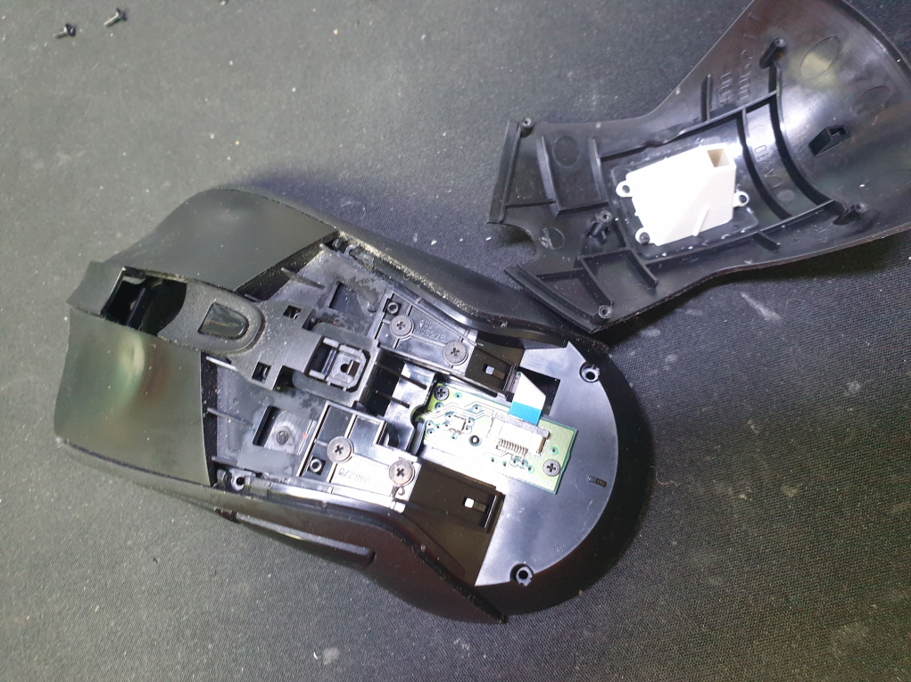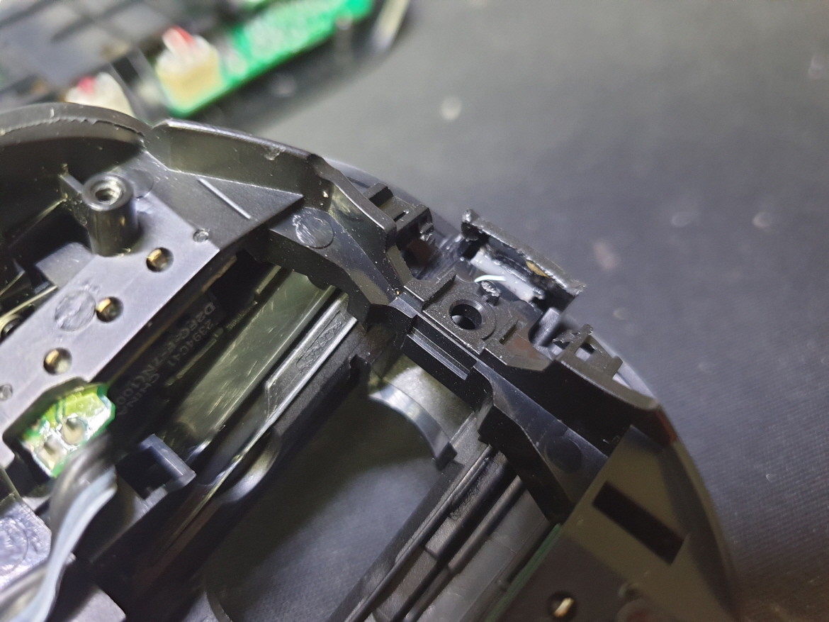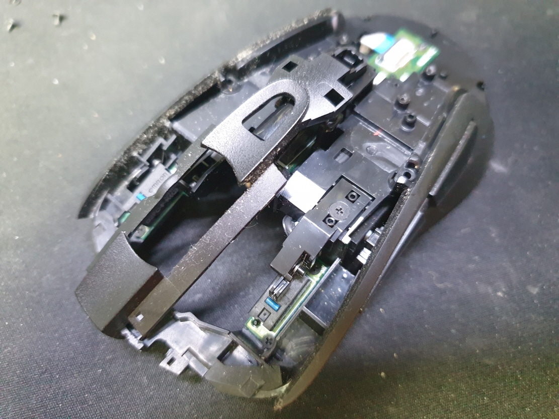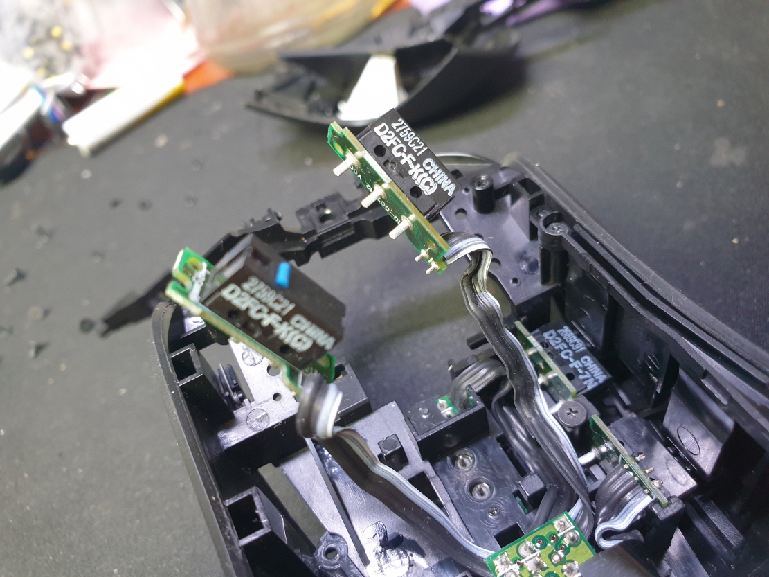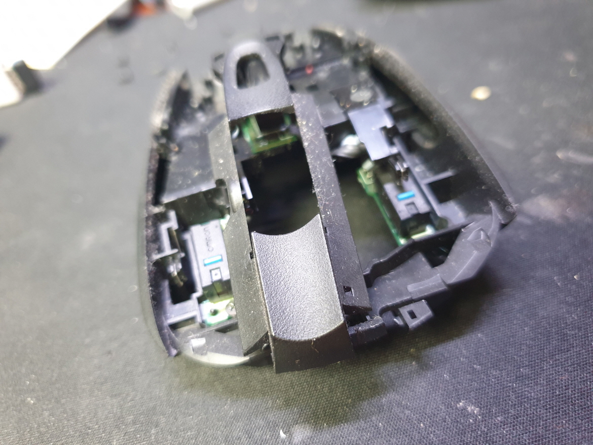 마우스 앞부분에 충격을 가격당했는지 고정부분이 파손되어 발생된 문제로 보여집니다...파손된 부분 수선하고 새 스위치 D2FC-F-7N(100M) 좌우교체 수리 진행합니다.